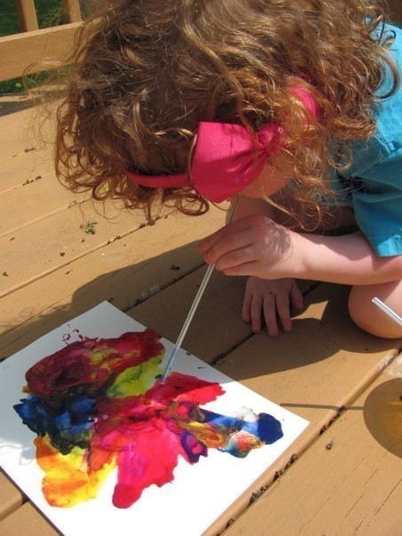 Дети 2-3 лет могут и не справиться с этой задачей, а вот деткам от 4 лет - это занятие должно прийтись по душе, к тому же оно выступает и зарядкой для артикуляционного аппарата. Но следите, чтобы ребенку не было трудно дуть на краску, чтобы она легко расползалась по листу, иначе голова может закружиться и интерес пропасть. :) Если со сметанообразными красками ребенку трудно управиться, воспользуйтесь акварелью. Только будьте готовы, что и ребенок, и место вокруг него будет все страшно перепачкано :)